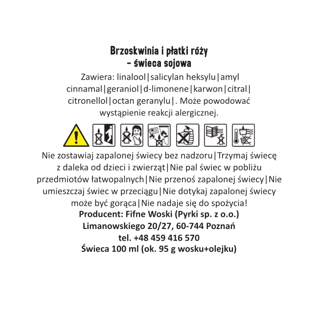 - Ostrzeżenia ogólne: Nigdy nie pozostawiaj zapalonej świecy bez nadzoru. Trzymaj z dala od dzieci i zwierząt. Używaj w bezpiecznej odległości od materiałów łatwopalnych. Produkt nie jest przeznaczony do spożycia. W przypadku połknięcia należy zasięgnąć pomocy medycznej.