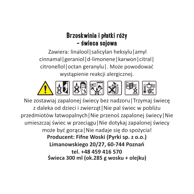 - Ostrzeżenia ogólne: Nigdy nie pozostawiaj zapalonej świecy bez nadzoru. Trzymaj z dala od dzieci i zwierząt. Używaj w bezpiecznej odległości od materiałów łatwopalnych. Produkt nie jest przeznaczony do spożycia. W przypadku połknięcia należy zasięgnąć pomocy medycznej.