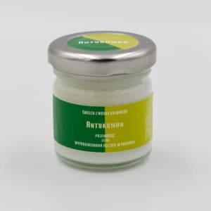 Świeca sojowa ANTYKOMAR w rozmiarze S to słoik o pojemności 40 ml, który zawiera co najmniej 35 ml wosku zapachowego.