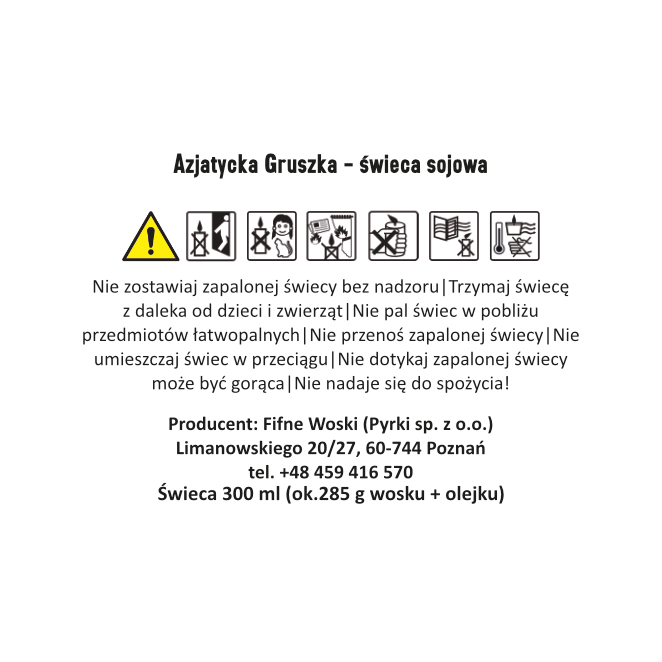- Ostrzeżenia ogólne: Nigdy nie pozostawiaj zapalonej świecy bez nadzoru. Trzymaj z dala od dzieci i zwierząt. Używaj w bezpiecznej odległości od materiałów łatwopalnych. Produkt nie jest przeznaczony do spożycia. W przypadku połknięcia należy zasięgnąć pomocy medycznej.