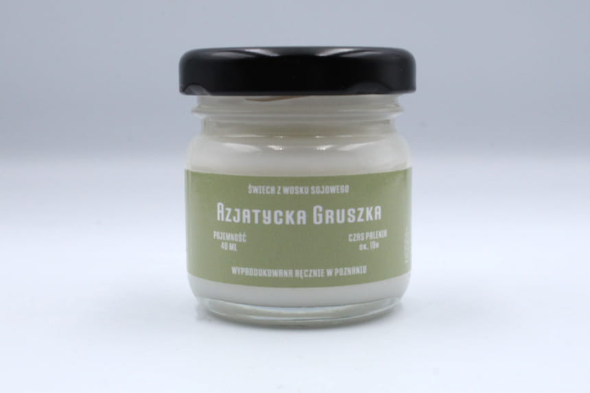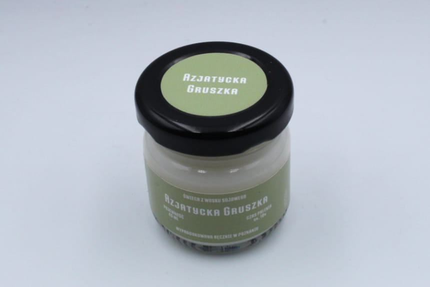 Świeca sojowa AZJATYCKA GRUSZKA w rozmiarze S to słoik o pojemności 40 ml, który zawiera co najmniej 35 ml wosku zapachowego.
