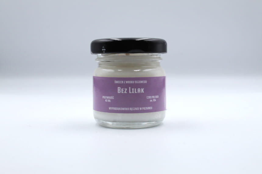 Świeca sojowa BEZ LILAK w rozmiarze S to słoik o pojemności 40 ml, który zawiera co najmniej 35 ml wosku zapachowego.