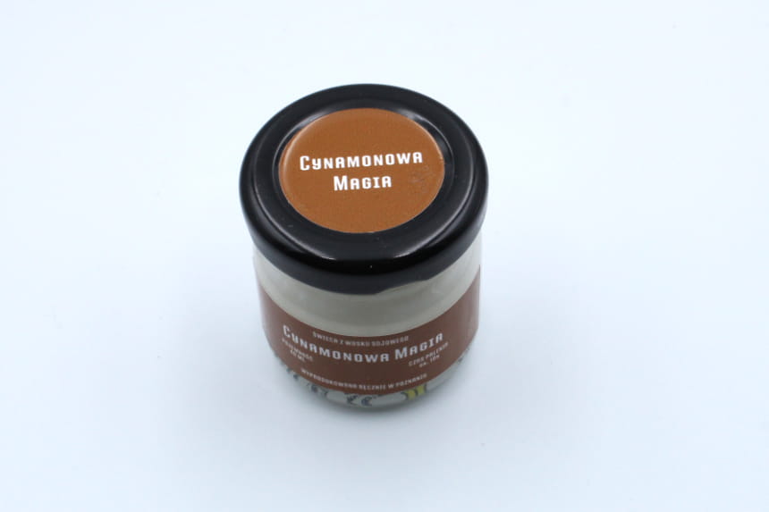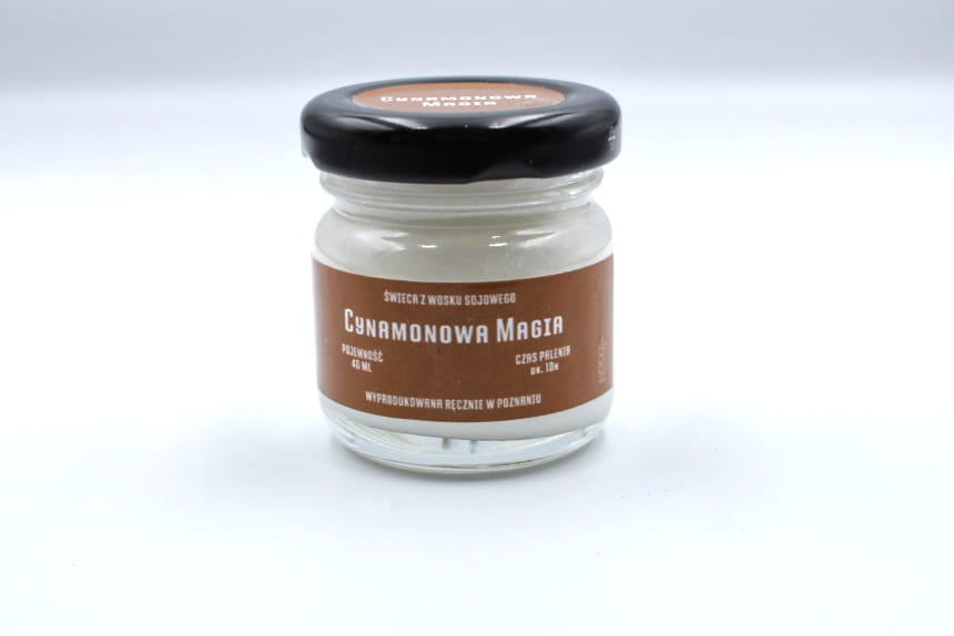 Świeca sojowa CYNAMONOWA MAGIA w rozmiarze S to słoik o pojemności 40 ml, który zawiera co najmniej 35 ml wosku zapachowego.