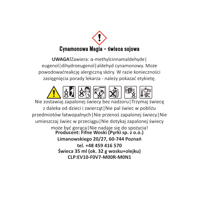 - Ostrzeżenia ogólne: Nigdy nie pozostawiaj zapalonej świecy bez nadzoru. Trzymaj z dala od dzieci i zwierząt. Używaj w bezpiecznej odległości od materiałów łatwopalnych. Produkt nie jest przeznaczony do spożycia. W przypadku połknięcia należy zasięgnąć pomocy medycznej.