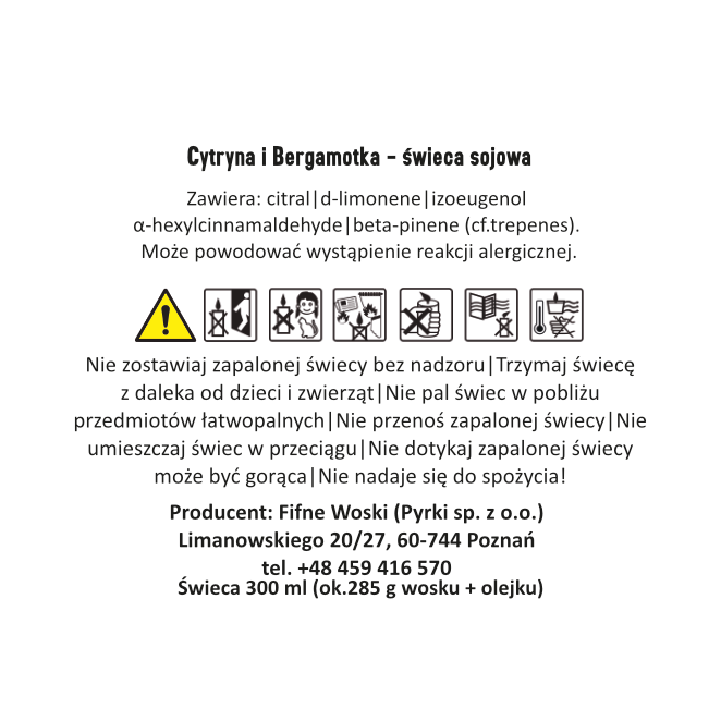 - Ostrzeżenia ogólne: Nigdy nie pozostawiaj zapalonej świecy bez nadzoru. Trzymaj z dala od dzieci i zwierząt. Używaj w bezpiecznej odległości od materiałów łatwopalnych. Produkt nie jest przeznaczony do spożycia. W przypadku połknięcia należy zasięgnąć pomocy medycznej.