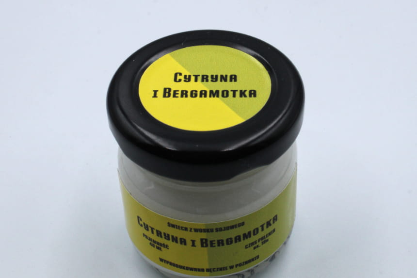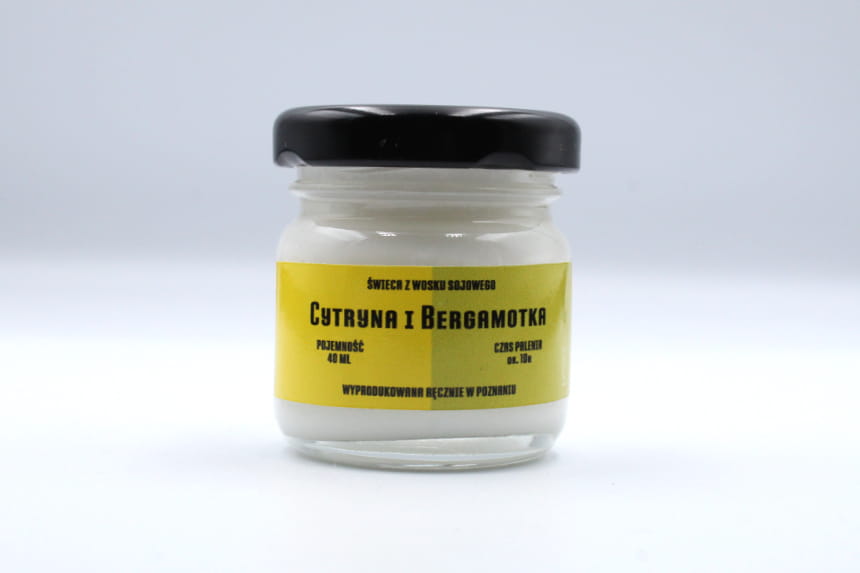 Świeca sojowa CYTRYNA I BERGAMOTKA w rozmiarze S to słoik o pojemności 40 ml, który zawiera co najmniej 35 ml wosku zapachowego.