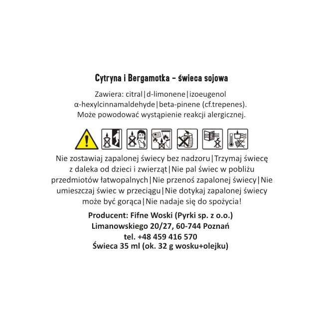 - Ostrzeżenia ogólne: Nigdy nie pozostawiaj zapalonej świecy bez nadzoru. Trzymaj z dala od dzieci i zwierząt. Używaj w bezpiecznej odległości od materiałów łatwopalnych. Produkt nie jest przeznaczony do spożycia. W przypadku połknięcia należy zasięgnąć pomocy medycznej.