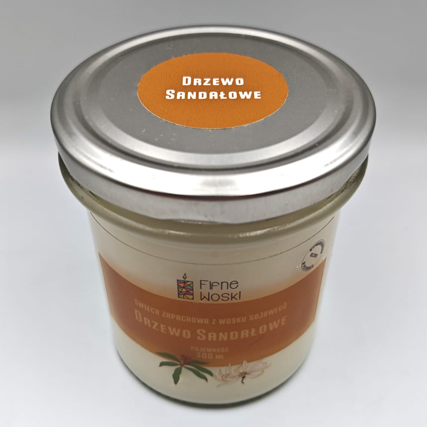 Świeca sojowa DRZEWO SANDAŁOWE w rozmiarze XL to słoik o pojemności 350 ml, który zawiera co najmniej 300 ml wosku zapachowego.