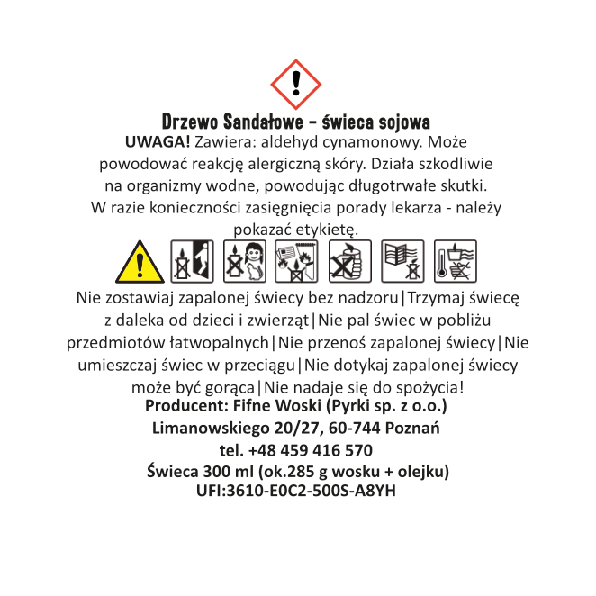 - Ostrzeżenia ogólne: Nigdy nie pozostawiaj zapalonej świecy bez nadzoru. Trzymaj z dala od dzieci i zwierząt. Używaj w bezpiecznej odległości od materiałów łatwopalnych. Produkt nie jest przeznaczony do spożycia. W przypadku połknięcia należy zasięgnąć pomocy medycznej.