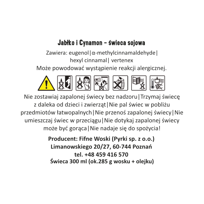 - Ostrzeżenia ogólne: Nigdy nie pozostawiaj zapalonej świecy bez nadzoru. Trzymaj z dala od dzieci i zwierząt. Używaj w bezpiecznej odległości od materiałów łatwopalnych. Produkt nie jest przeznaczony do spożycia. W przypadku połknięcia należy zasięgnąć pomocy medycznej.