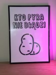 Na plakacie znajdziecie napis "Kto pyra nie błądzi" oraz pyrki w kolorze czarnym, na białym tle w formacie pionowym w rozmiarze A3. Jest to nadruk idealny dla każdego mieszkańca miasta podziemnych pomarańczy!