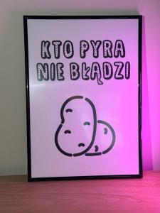 "Kto pyra nie błądzi" to jedno z pierwszych haseł jakie wymyśliliśmy dla Fifnych Klunkrów. Szukając nazwy firmy (a nazywamy się Pyrki), od razu podjęliśmy decyzję, że hasło ozdobi jedną z naszych toreb bawełnianych, a teraz również plakat.