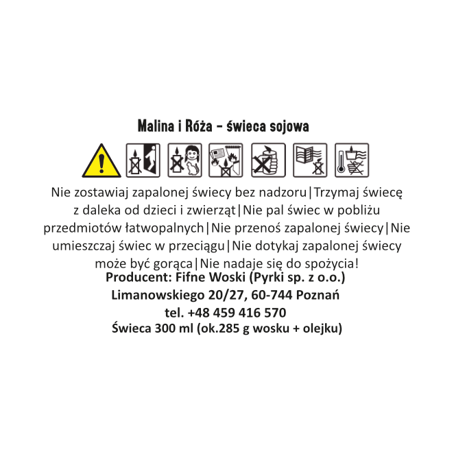 - Ostrzeżenia ogólne: Nigdy nie pozostawiaj zapalonej świecy bez nadzoru. Trzymaj z dala od dzieci i zwierząt. Używaj w bezpiecznej odległości od materiałów łatwopalnych. Produkt nie jest przeznaczony do spożycia. W przypadku połknięcia należy zasięgnąć pomocy medycznej.