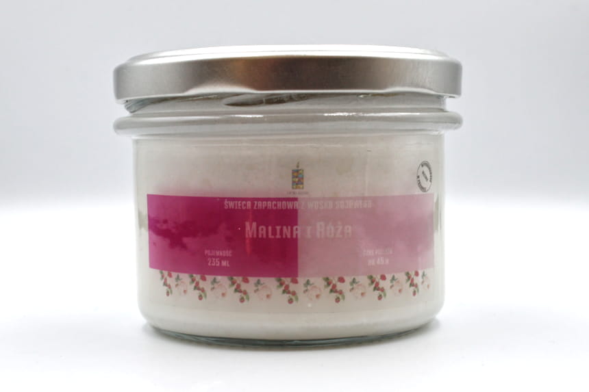 Świeca sojowa MALINA I RÓŻA w rozmiarze L to słoik o pojemności 235 ml, który zawiera co najmniej 200 ml wosku zapachowego.