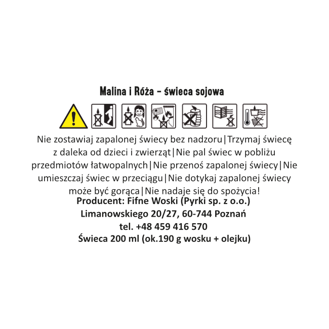 - Ostrzeżenia ogólne: Nigdy nie pozostawiaj zapalonej świecy bez nadzoru. Trzymaj z dala od dzieci i zwierząt. Używaj w bezpiecznej odległości od materiałów łatwopalnych. Produkt nie jest przeznaczony do spożycia. W przypadku połknięcia należy zasięgnąć pomocy medycznej.