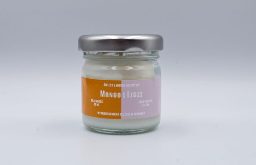 Świeca sojowa MANGO I LICZI w rozmiarze S to słoik o pojemności 40 ml, który zawiera co najmniej 35 ml wosku zapachowego.
