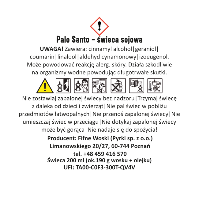 - Ostrzeżenia ogólne: Nigdy nie pozostawiaj zapalonej świecy bez nadzoru. Trzymaj z dala od dzieci i zwierząt. Używaj w bezpiecznej odległości od materiałów łatwopalnych. Produkt nie jest przeznaczony do spożycia. W przypadku połknięcia należy zasięgnąć pomocy medycznej.