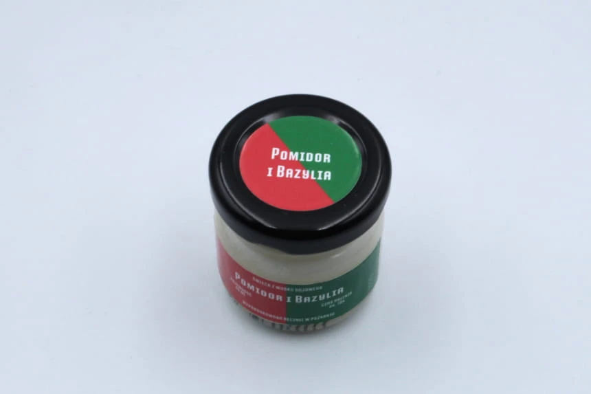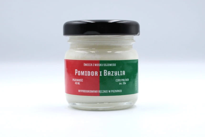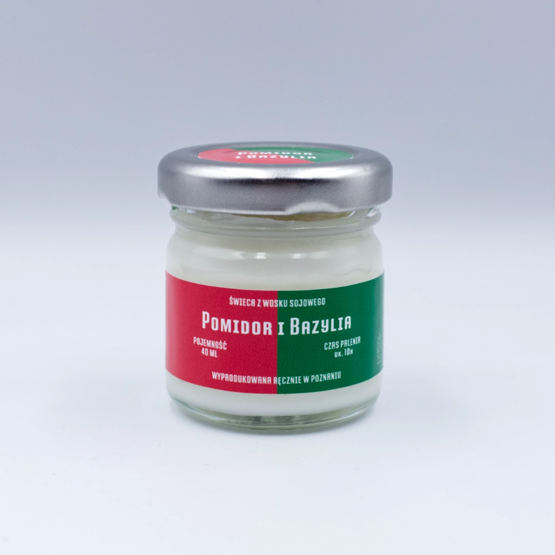 Świeca sojowa POMIDOR I BAZYLIA w rozmiarze S to słoik o pojemności 40 ml, który zawiera co najmniej 35 ml wosku zapachowego.