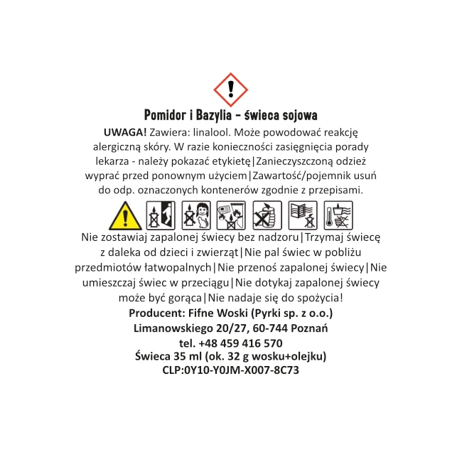 - Ostrzeżenia ogólne: Nigdy nie pozostawiaj zapalonej świecy bez nadzoru. Trzymaj z dala od dzieci i zwierząt. Używaj w bezpiecznej odległości od materiałów łatwopalnych. Produkt nie jest przeznaczony do spożycia. W przypadku połknięcia należy zasięgnąć pomocy medycznej.