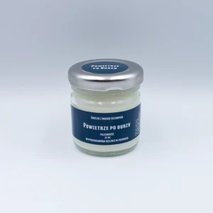 Świeca sojowa POWIETRZE PO BURZY w rozmiarze S to słoik o pojemności 40 ml, który zawiera co najmniej 35 ml wosku zapachowego.