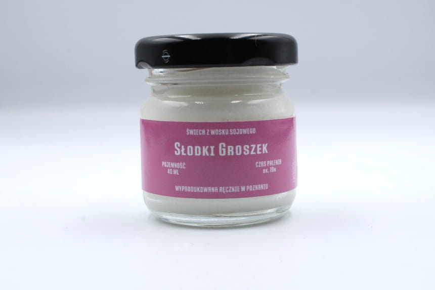 Świeca sojowa SŁODKI GROSZEK w rozmiarze S to słoik o pojemności 40 ml, który zawiera co najmniej 35 ml wosku zapachowego.