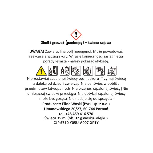 - Ostrzeżenia ogólne: Nigdy nie pozostawiaj zapalonej świecy bez nadzoru. Trzymaj z dala od dzieci i zwierząt. Używaj w bezpiecznej odległości od materiałów łatwopalnych. Produkt nie jest przeznaczony do spożycia. W przypadku połknięcia należy zasięgnąć pomocy medycznej.