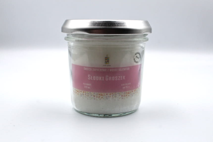 Świeca sojowa SŁODKI GROSZEK w rozmiarze M to słoik o pojemności 120 ml, który zawiera co najmniej 100 ml wosku zapachowego.