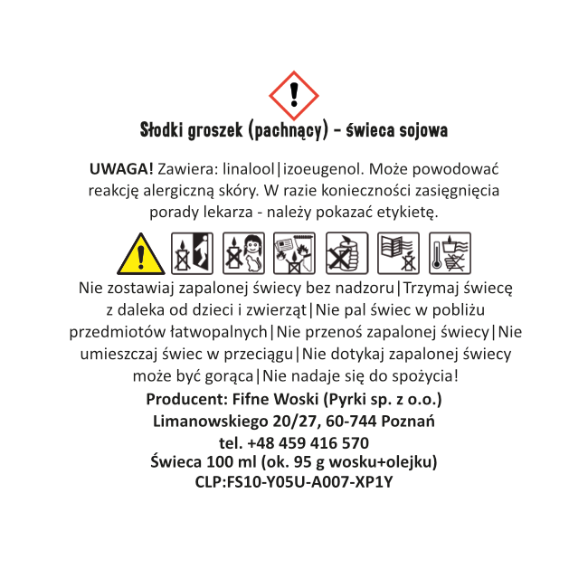 - Ostrzeżenia ogólne: Nigdy nie pozostawiaj zapalonej świecy bez nadzoru. Trzymaj z dala od dzieci i zwierząt. Używaj w bezpiecznej odległości od materiałów łatwopalnych. Produkt nie jest przeznaczony do spożycia. W przypadku połknięcia należy zasięgnąć pomocy medycznej.
