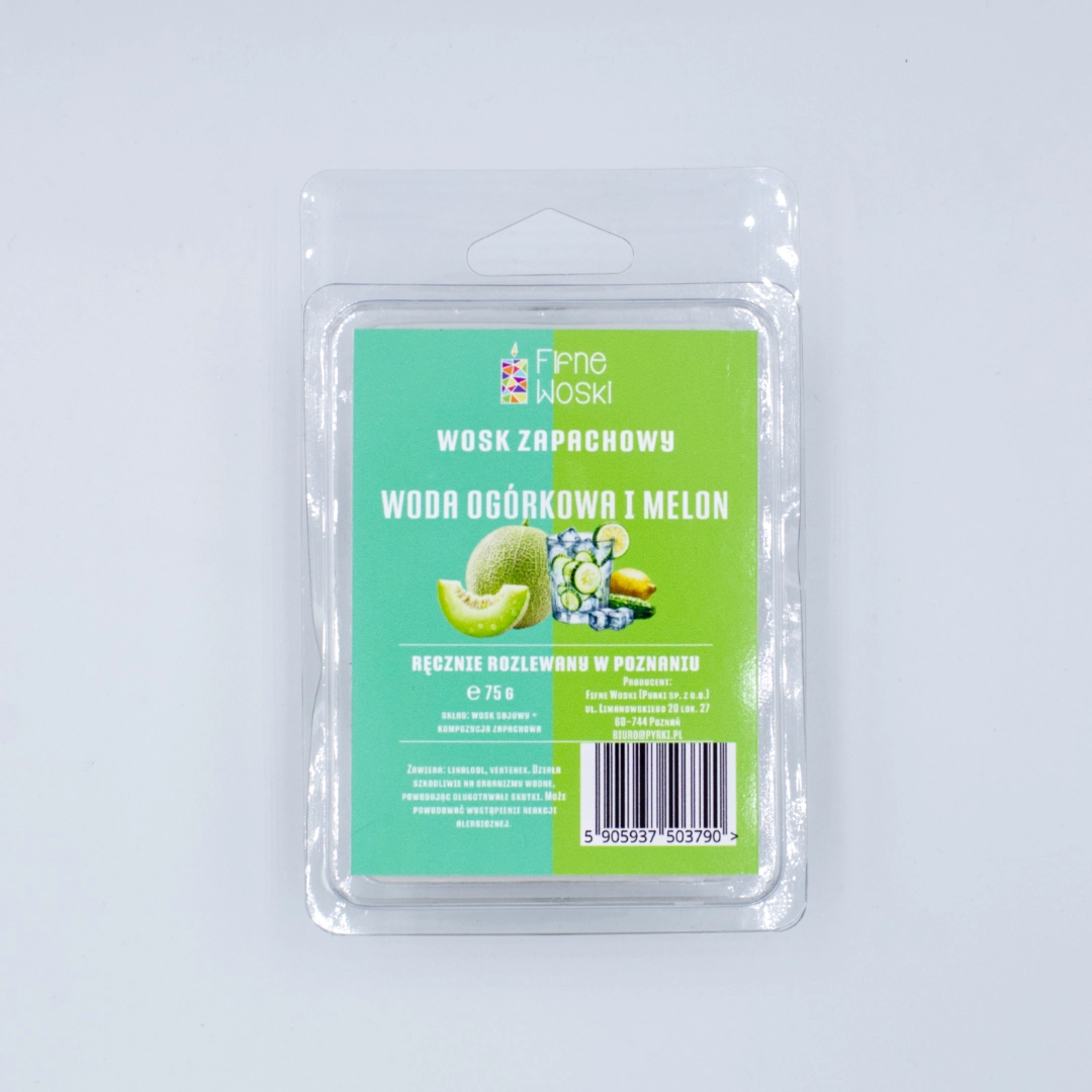 WODA OGÓRKOWA I MELON to nie mniej niż 75 g sojowego wosku zapachowego. Fifne Woski rozlewamy ręcznie na poznańskim Łazarzu.