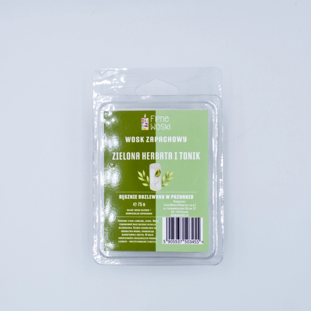ZIELONA HERBATA I TONIK to nie mniej niż 75 g sojowego wosku zapachowego. Fifne Woski rozlewamy ręcznie na poznańskim Łazarzu.