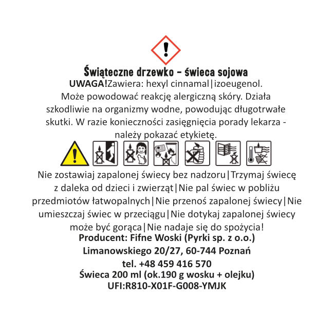 - Ostrzeżenia ogólne: Nigdy nie pozostawiaj zapalonej świecy bez nadzoru. Trzymaj z dala od dzieci i zwierząt. Używaj w bezpiecznej odległości od materiałów łatwopalnych. Produkt nie jest przeznaczony do spożycia. W przypadku połknięcia należy zasięgnąć pomocy medycznej.