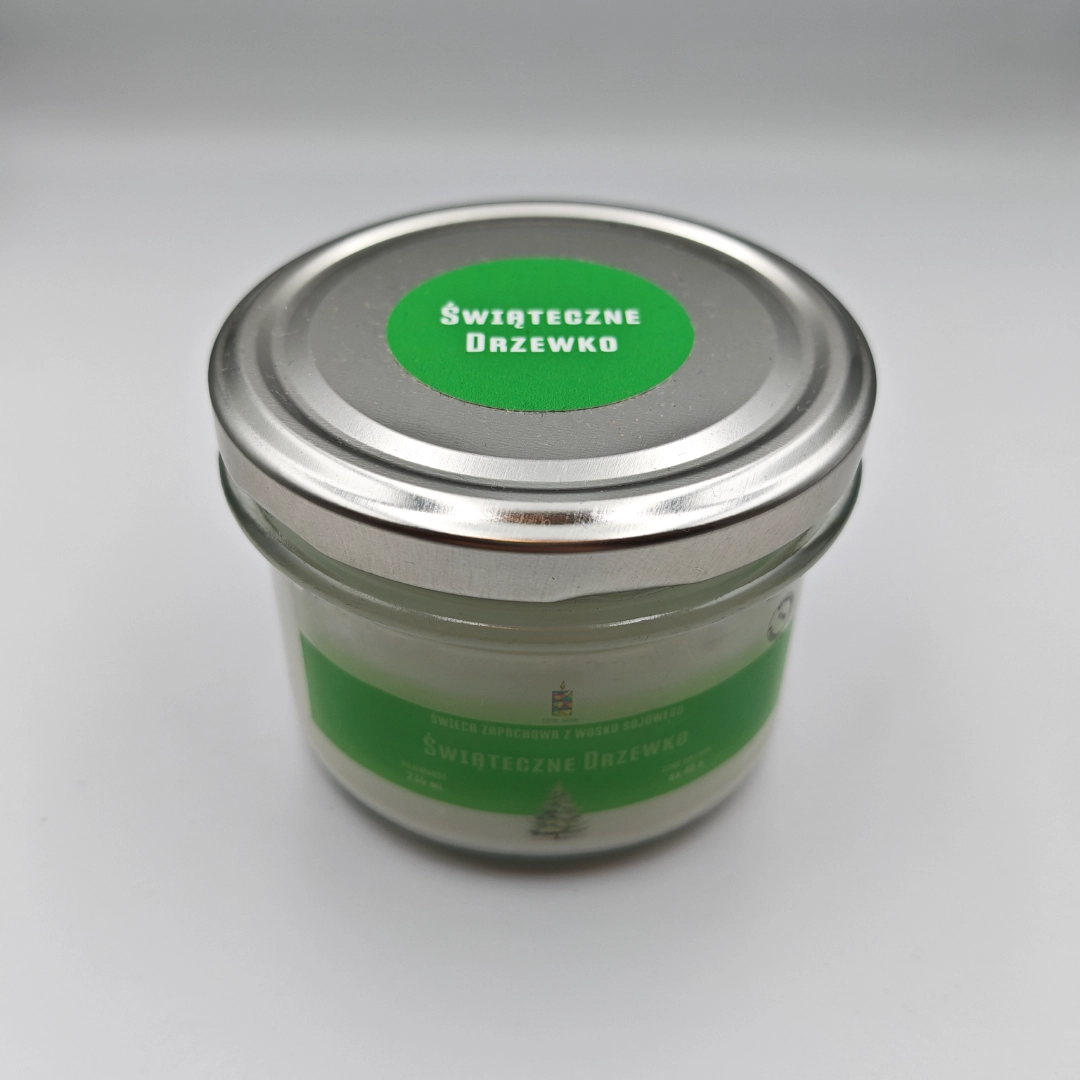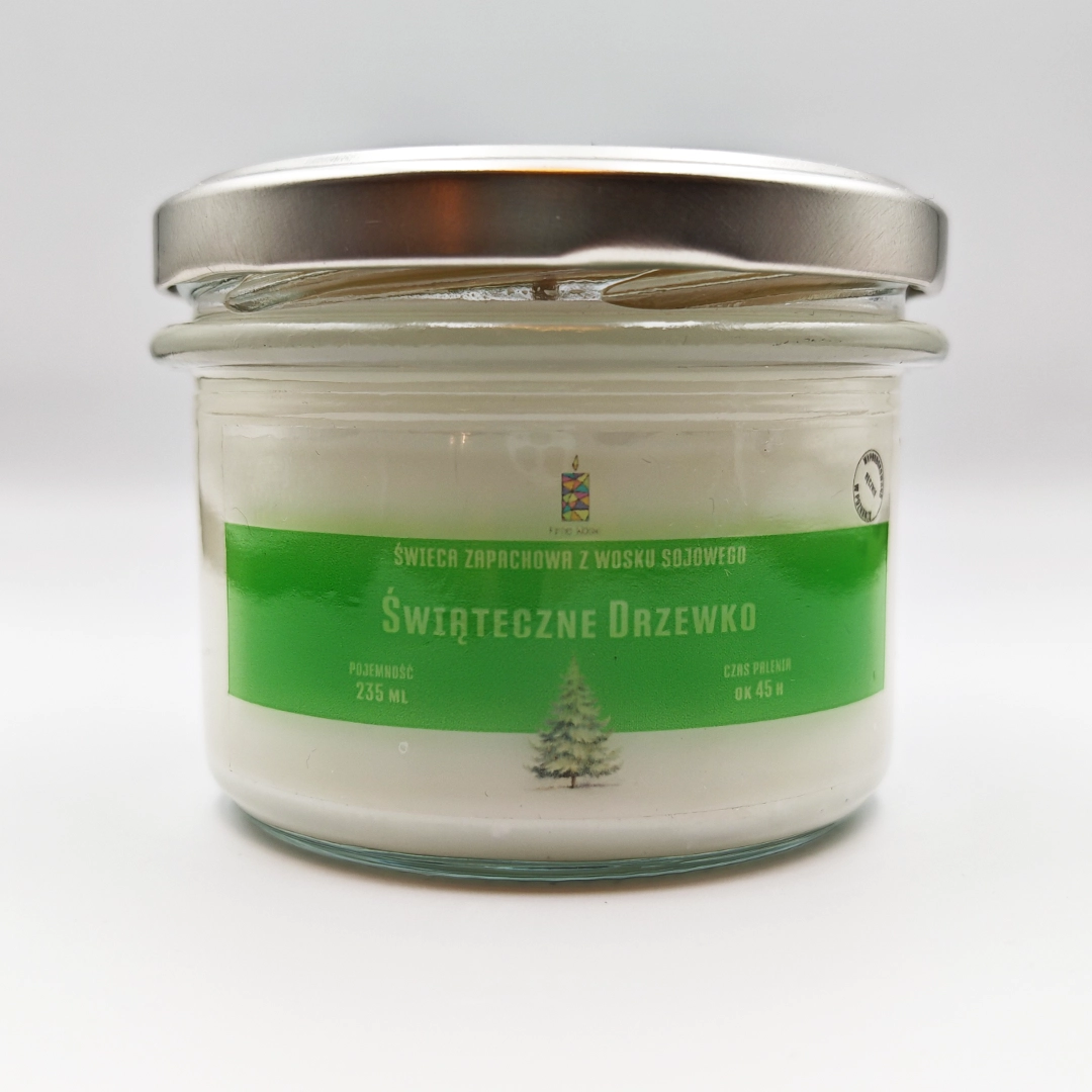 Świeca sojowa ŚWIĄTECZNE DRZEWKO w rozmiarze L to słoik o pojemności 235 ml, który zawiera co najmniej 200 ml wosku zapachowego.