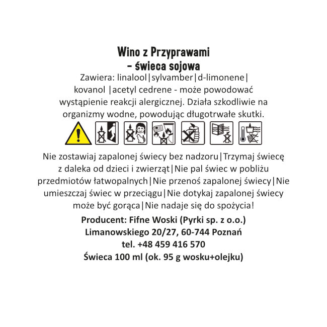- Ostrzeżenia ogólne: Nigdy nie pozostawiaj zapalonej świecy bez nadzoru. Trzymaj z dala od dzieci i zwierząt. Używaj w bezpiecznej odległości od materiałów łatwopalnych. Produkt nie jest przeznaczony do spożycia. W przypadku połknięcia należy zasięgnąć pomocy medycznej.