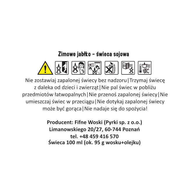 - Ostrzeżenia ogólne: Nigdy nie pozostawiaj zapalonej świecy bez nadzoru. Trzymaj z dala od dzieci i zwierząt. Używaj w bezpiecznej odległości od materiałów łatwopalnych. Produkt nie jest przeznaczony do spożycia. W przypadku połknięcia należy zasięgnąć pomocy medycznej.